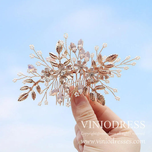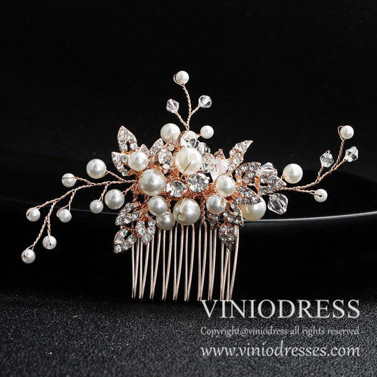 Rose Gold Metal Leaf Hair Comb with Pearls and Crystals AC1052