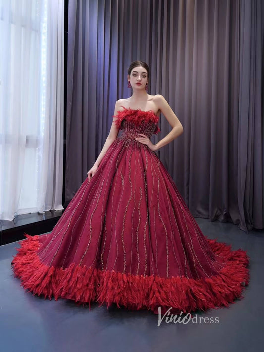 Dark Red Beaded Feather Ball Gown Wedding Dreses Plus Size Princess Dress 222232