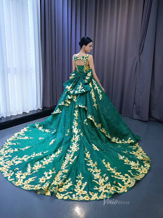Gold Flower Green Wedding Dresses Sparly Tulle Ball Gowns 231050