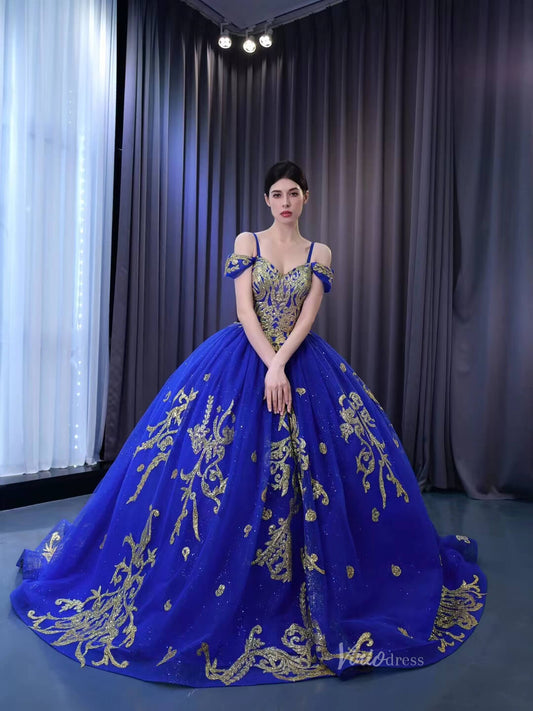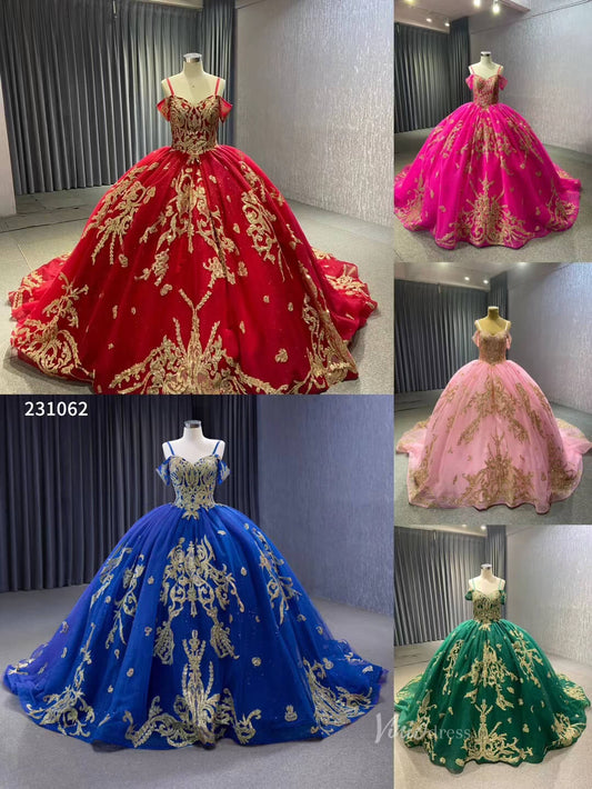 Gold Lace Appliqued Tulle Ball Gown Wedding Dress Sweet 16 Dress 231062