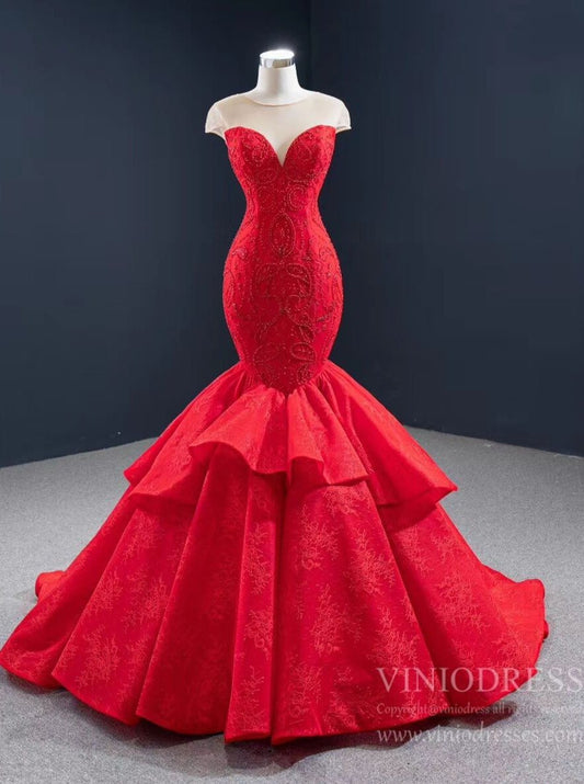 Beaded Red Mermaid Prom Dresses Plunging V-neck Formal Dress 67151 viniodress