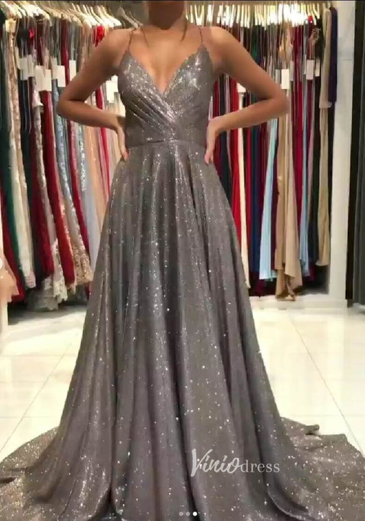 A-line V-neck Sequin Prom Dresses Long with Pockets FD2520 A-line, V-neck