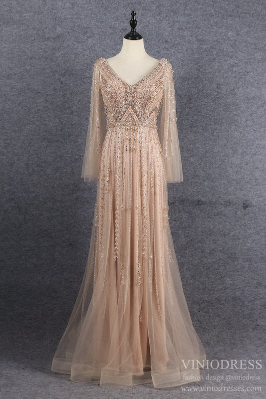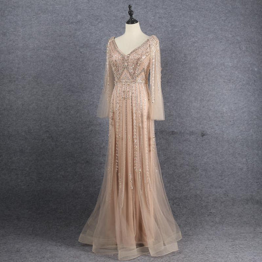 Beaded Formal Evening Dresses V-neck Long Sleeve Prom Dress FD2606