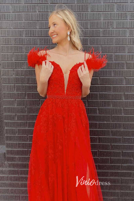 Red Lace Applique Prom Dresses with Slit Feather Plunging V-Neck Formal Gown FD1247D