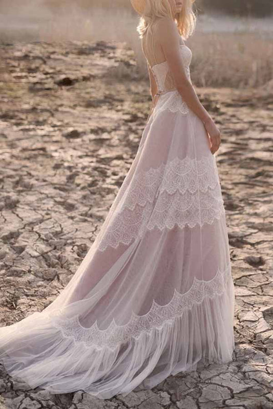Spaghetti Strap Bohemian Lace Beach Wedding Dress | A-Line Gown with Lace-Up Back & Pockets VW2104