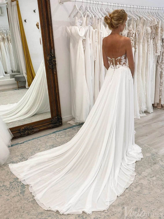 Ivory Sweetheart Lace Applique Wedding Dresses with Slit Strapless Chiffon Bridal Gown AW1017