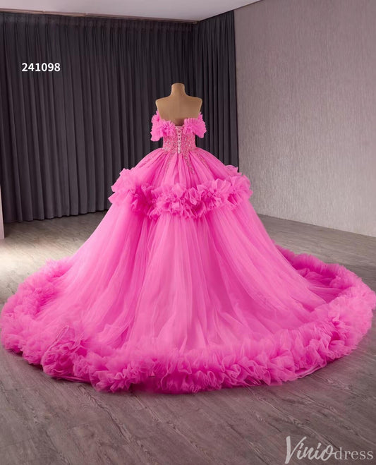 Hot Pink Ruffle Wedding Dresses Tulel Ball Gown Off the Shoulder Quinceanera Dress 241098