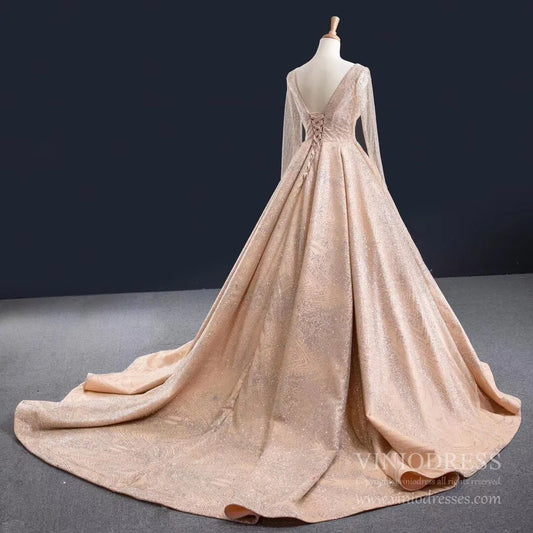 Long Sleeve Sparkly Rose Gold Ball Gown Wedding Dresses FD1997 viniodress