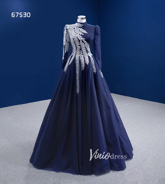 Modest High Neck Ball Gown Long Sleeve Formal Dresses 67530