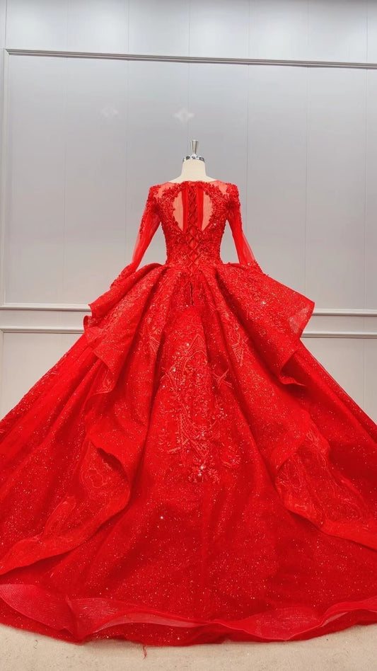 Modest High Neck Red Wedding Dress Long Sleeve Layered Ball Gown 67498