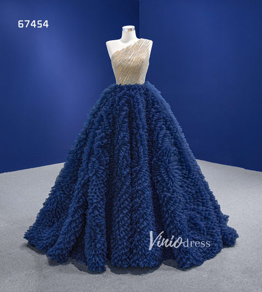 Navy Blue Sweet 16 Ball Gown One Shoulder Ruffle Quince Dresses 67454