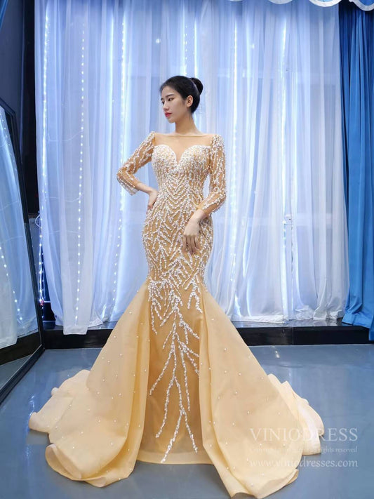 Beaded Light Gold Mermaid Wedding Dress Long Sleeve 67211 viniodress