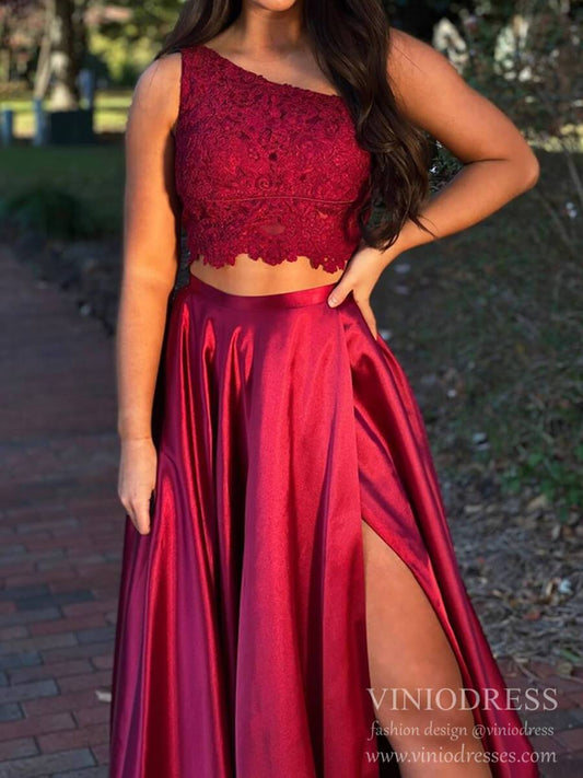 One Shoulder Two Piece Dark Red Prom Dresses with Pockets FD2031