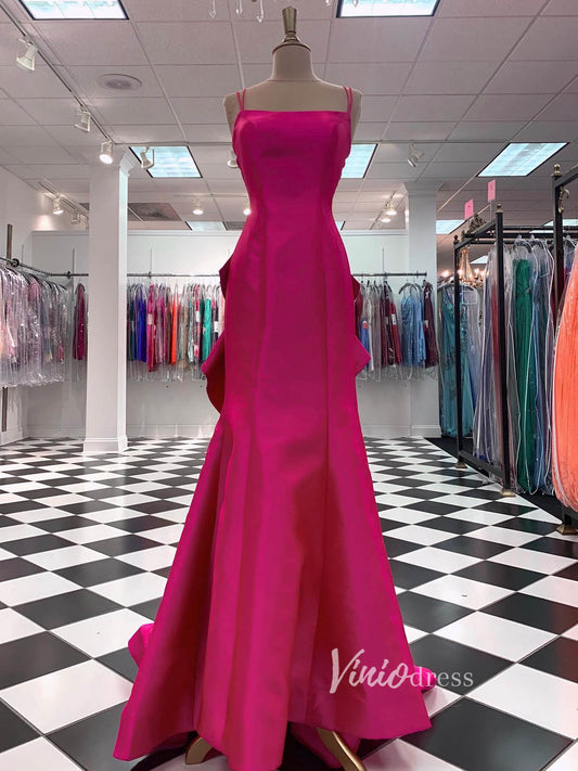 Hot Pink Satin Prom Dresses with Slit, Strapless Mermaid Dress with Bow FD3267