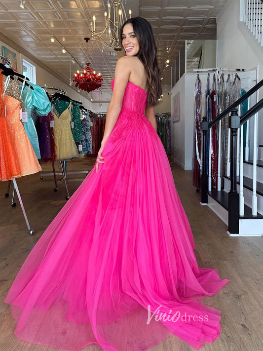 Fuchsia Tulle Strapless Prom Dresses Lace Bodice Formal Gown FD3608