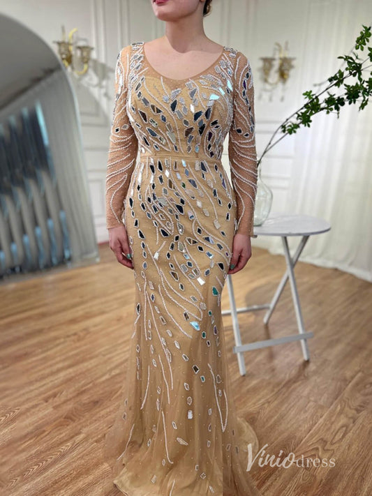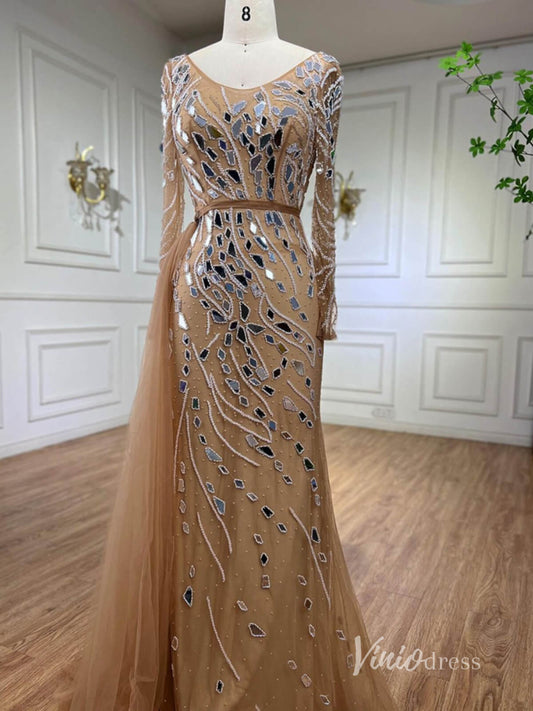 Khaki Beaded Long Sleeve Evening Dresses Mermaid Formal Dress AD1142