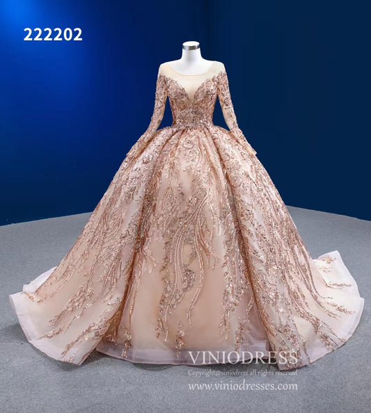 Long Sleeve Sequin Ball Gowns Rose Gold Wedding Dresses 222202