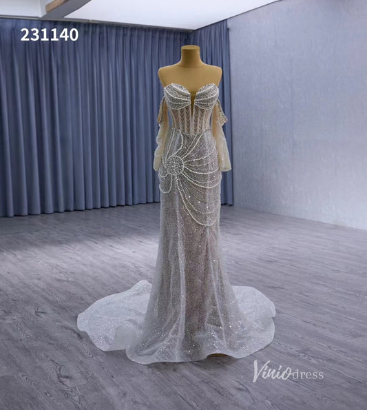 Nude Pearl Beaded Lace Mermaid Wedding Dresses Removable Long Sleeve Pageant Dress 231140