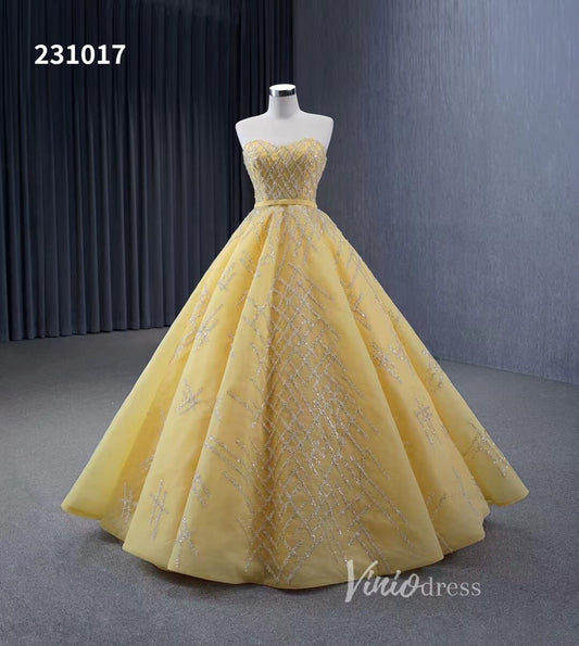 Sparkly Light Gold Ball Gown Prom Dresses Beaded Strapless Quince Dress 231017