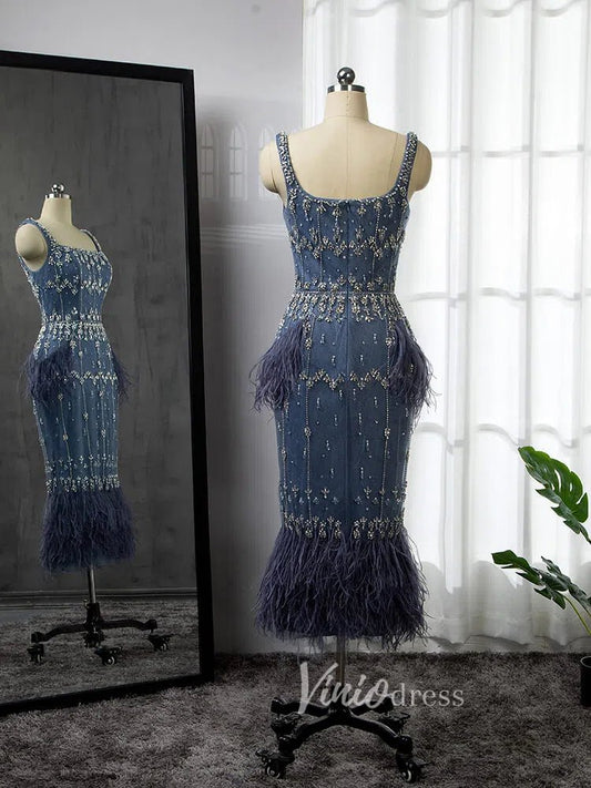 Square Neck Beaded Blue Evening Dresses Dusty Blue Tea Length Feather Dress 20020