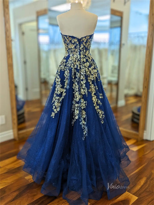 Blue Sparkly Tulle Prom Dresses with Floral Lace & Sweetheart Neck - FD5177