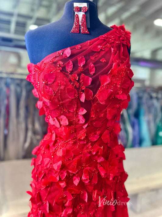 Red One Shoulder Lace Applique Prom Dresses Sheer Bodice FD4082