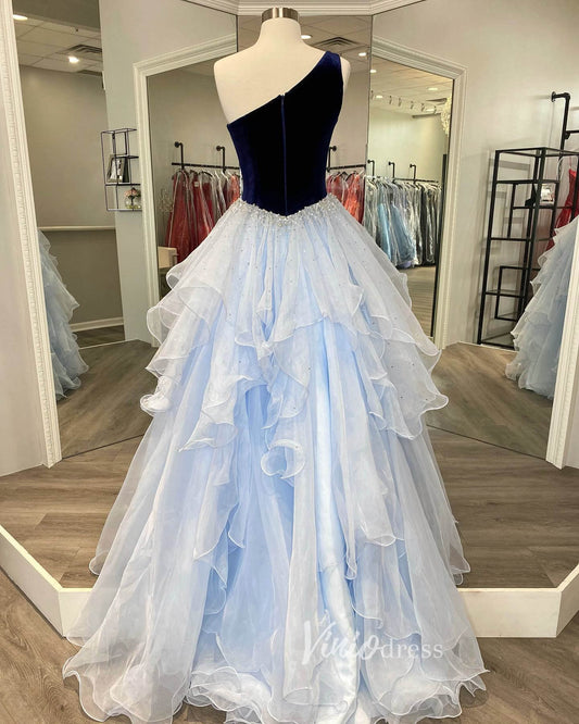 Royal Blue Velvet High-Low Prom Dress with One-Shoulder Neckline, Rhinestone Trim, and Sheer Overskirt – SS107