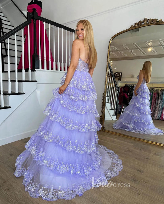 Lavender Sparkly Tulle Prom Dress with Lace Bodice, One Shoulder & Slit - FD6094