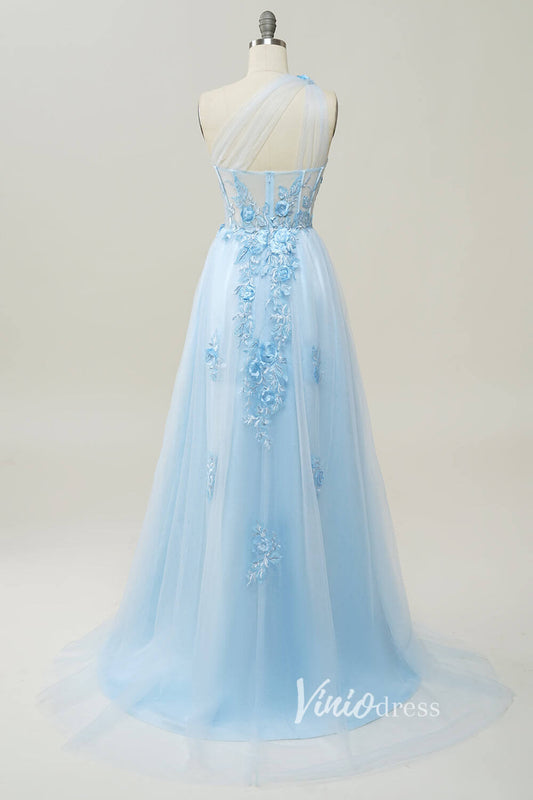 Light Blue Lace Applique Prom Dresses One Shoulder Evening Dress FD3404