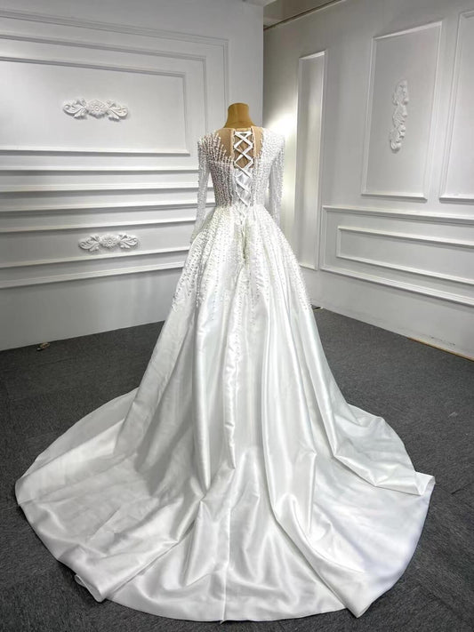 Long Sleeve High Neck Pearl Wedding Dresses with Overskirt VW2029