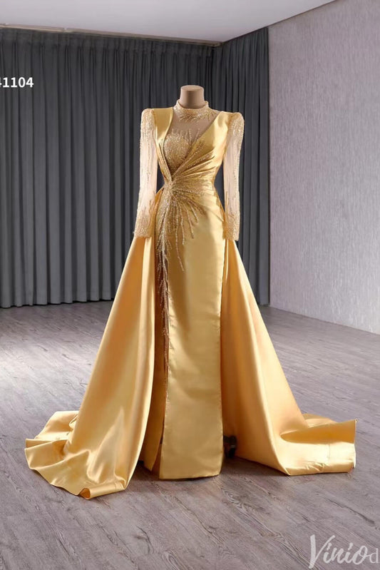 Long Sleeve Gold Formal Dresses Overskirt Wedding Dress with slit Open Back 241104