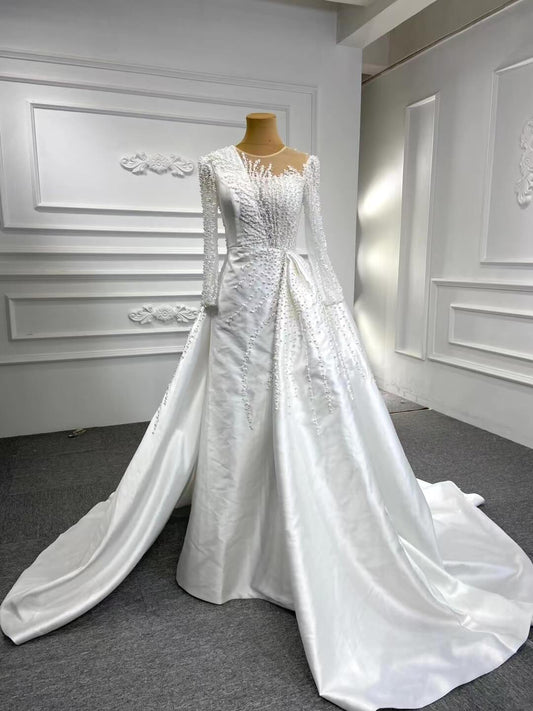 Long Sleeve Beaded Wedding Dresses with Satin Overskirt Detachable 67322