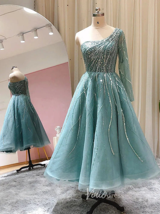 Beaded Light Green Tea Length Evening Dress One Shoulder Long Sleeve Prom Dress 20096