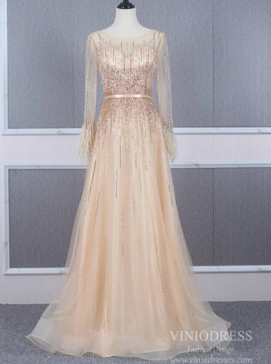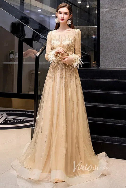 Beaded Long Sleeve Champagne Tulle Prom Dresses FD2504