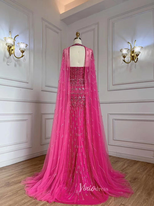 Beaded Magenta Pageant Dress with Cape 1920s Evening Dresses 20057