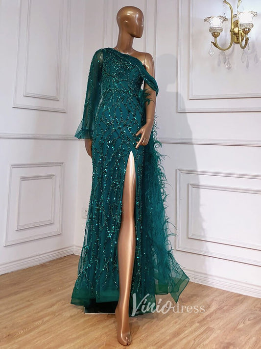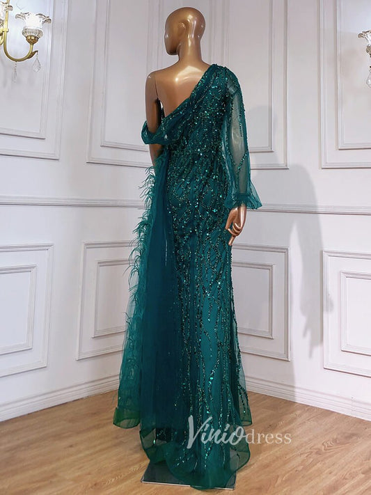 Beaded Mauve Feather Prom Dressses One Shoulder Long Sleeve Green Evening Dress 20009