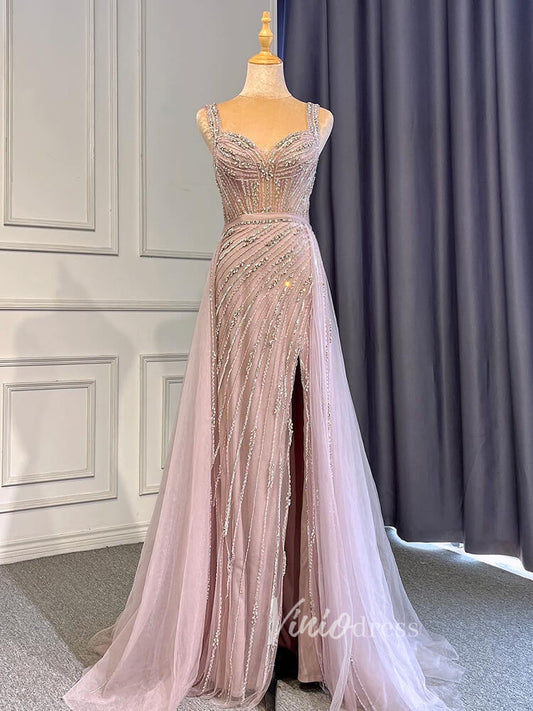 Beaded Mauve Prom Dresses Overskirt Sheath Gold Evening Dress with Slit 20010