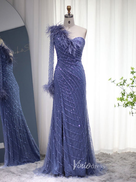 Beaded Navy Blue Prom Dresses One Shoulder Feather Long Sleeve Evening Dress 2008