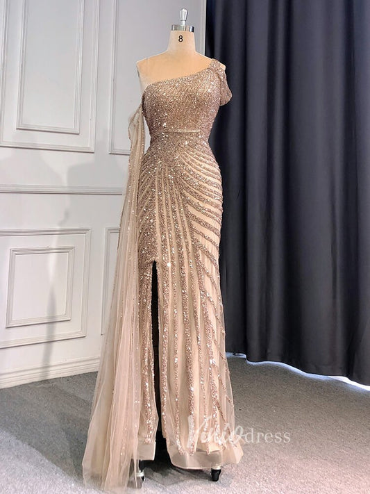 Beaded One Shoulder Prom Dresses with Slit Sheath Evening Gowns 20016