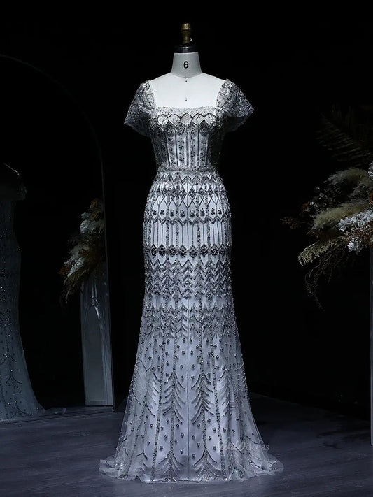 Beaded Silver Prom Dresses Convertible Sleeve Formal Dresses BD022