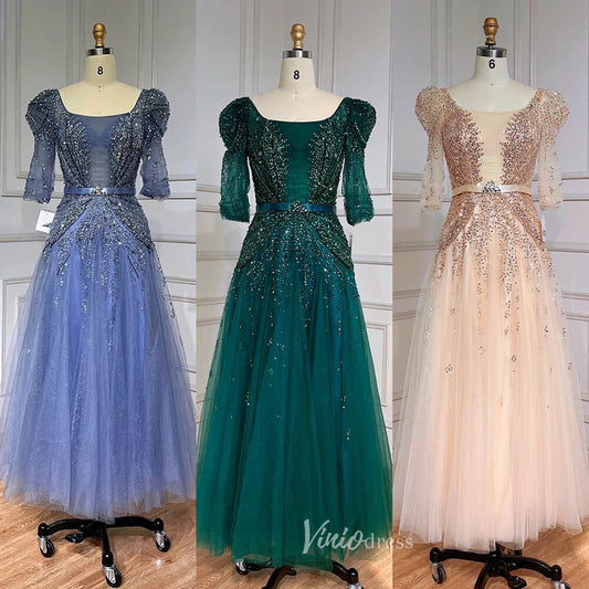 Beaded Tea Length Prom Dresses Elbow Sleeve Evening Dress 20040