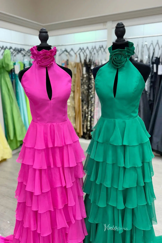 Light Blue Halter Prom Dress with Rosette High Neck, Tiered Ruffle Skirt & High Slit – RF311