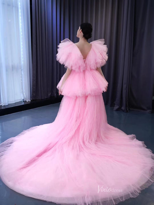 High Low Tiered Pink Pageant Dresses Ruffled Prom Gown 222131