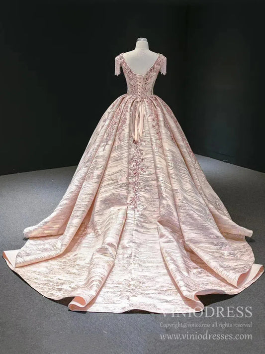 Beaded Floral Rose Gold Ball Gown Prom Dresses Long Train FD2403 viniodress