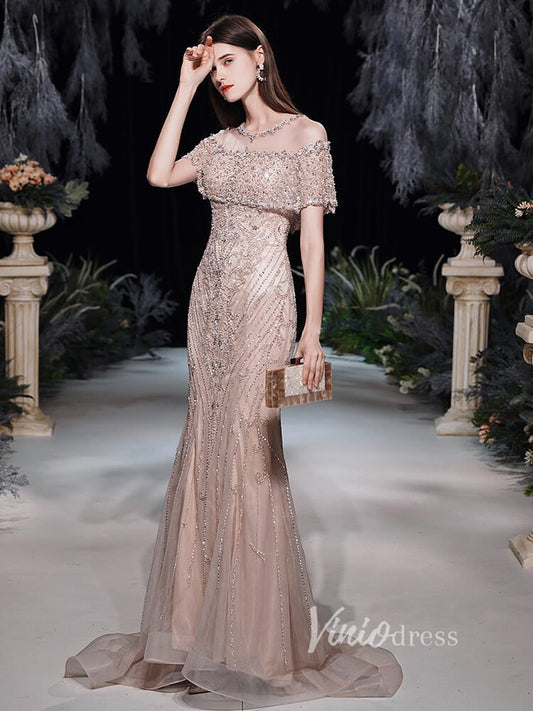 Taupe Beaded Sheath Prom Dresses Short Sleeve Evening Dress FD2476