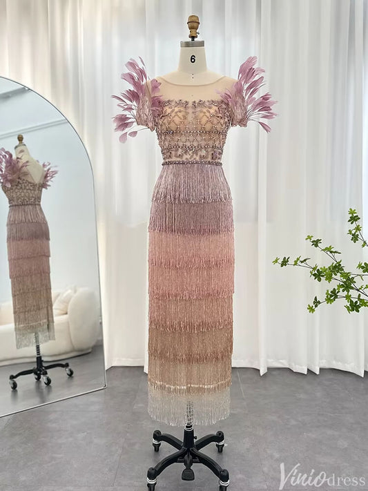 Tea Length Lavender 1920s Flapper Dresses Feather Wedding Guest Dress FD2474