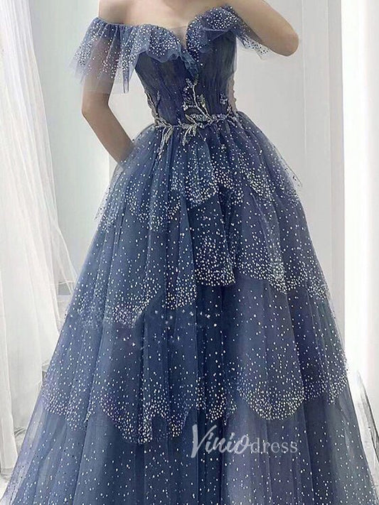 Tiered Dusty Blue Tulle Prom Dresses Off the Shoulder Ball Gown FD2495B