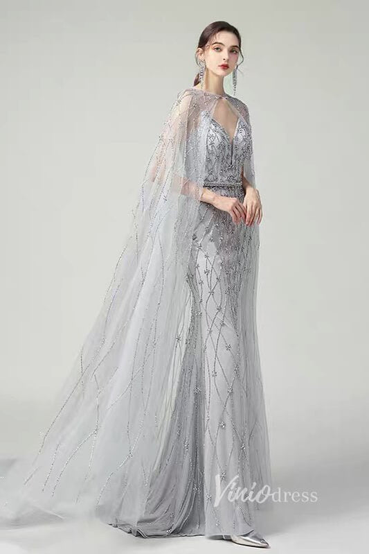 Two Piece Gray Beaded Mermaid 20s Prom Dresses with Short Cape FD2505