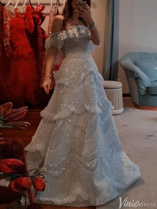 Beaded Tiere Ruffle Prom Dresses with Slit, Off the Shoulder FD3640D