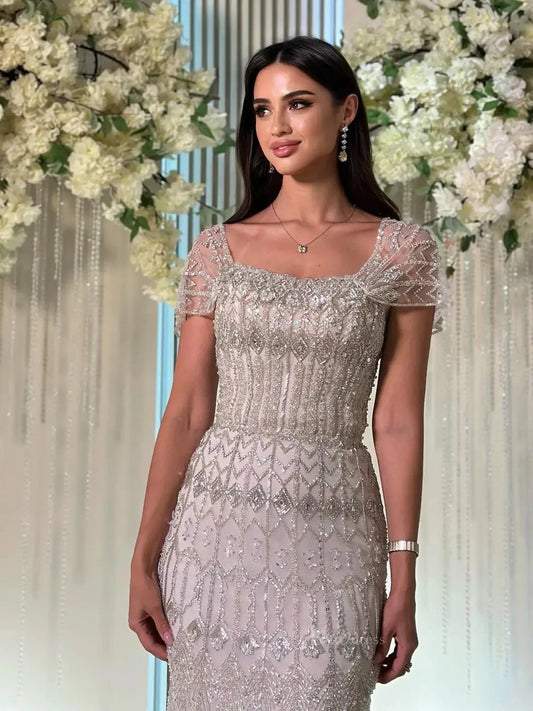 Beaded Wedding Guest Dress Extra Long Sleeve Square Neck Evening Gown FD1426